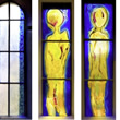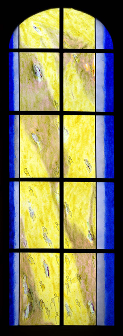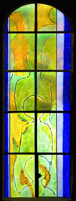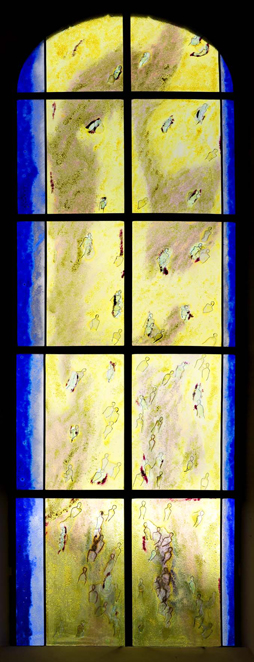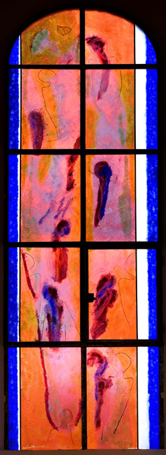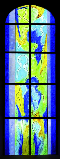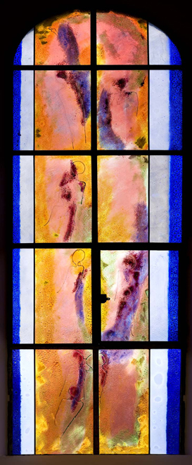 Avançant dans la nef, on aperçoit les quatre derniers vitraux.Ici les figures subissent une profonde mutation, leur mouvement est maintenant ascendant. Elles sont en train de monter, de s’élever. C’est qu’entre temps, s’étant allégées, désencombrées, elles sont rentrées dans la dimension du spirituel.Et elles nous invitent à les suivre.
