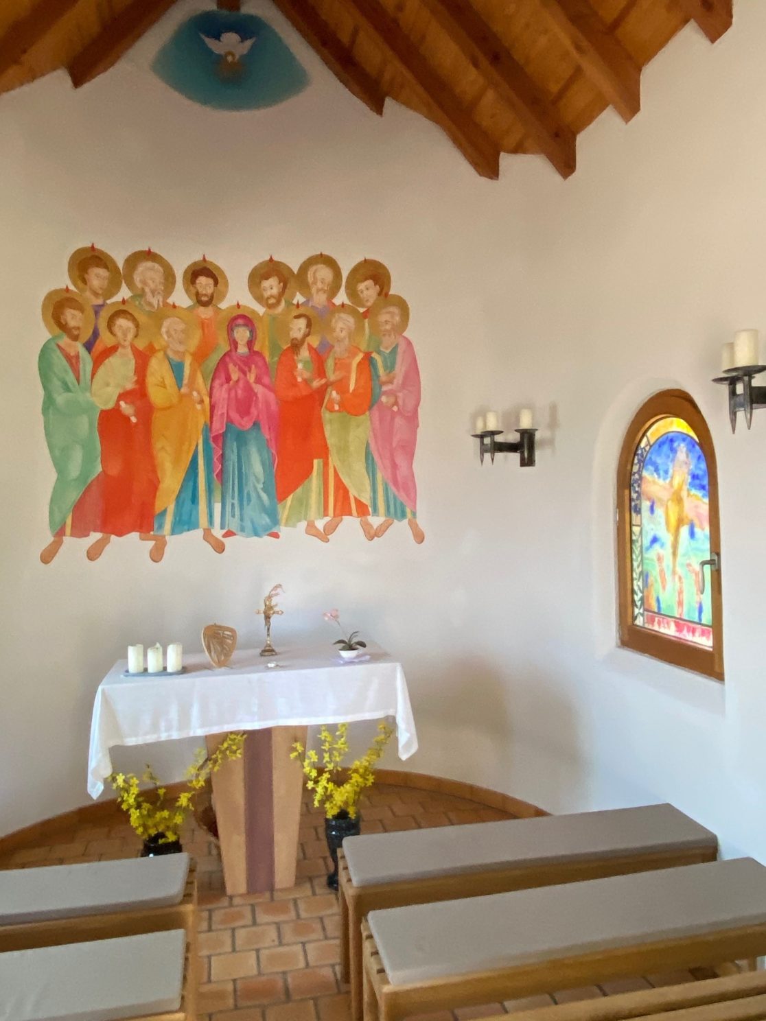 Les grandes figures des quatre fenêtres du fond, plus figées, plus statiques, dégagent une douce présence, attentives même, bienveillantes. C’est comme si, du haut de leur taille appréciable, elles montaient la garde. C’est comme si elles veillaient sur la communauté.